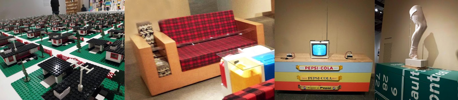 Canadian Identity was a major theme of the works in the portion of the exhibition hosted at MOCCA. A series of "still-life" photos depicted typical objects from various regions of Canada including lobster for the Maritimes, a Cowboy hat, toy tractor and hockey stick for the Prairies, and a polar bear, Inukshuk and fish for the Territories. A large-scaled sculpture represented a transmission tower bent by the powerful ice storm of 1998. Douglas Coupland produced abstract, simplified interpretations of iconic Canadian paintings such as Tom Thomson's Jack Pine and Lauren Harris' mountain scenes. An entire wall full of nostalgic Canadiana included items such as a goalie mask, hockey trading cards, Labatt's beer cans, license plates from various provinces, a snow shoe, a can of Carnation's Evaporated Milk, and even Asian foods including a bag of Lobster flavoured chips like the ones I buy from T&T Grocery stores.